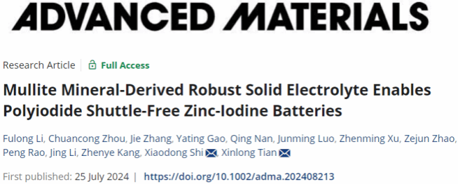 近日,海洋科学与工程学院史晓东副教授所在团队在能源化学领域顶级期刊Advanced Materials (IF=27.3)发表题为“Mullite mineral-derived robust solid electrolyte enables polyiodide shuttle-free zinc-iodine batteries”的研究论文。william威廉亚洲官方李富龙硕士(研一)、周传聪博士(博三)和张杰硕士(研二)为论文共同第一作者,william威廉亚洲官方史晓东副教授和田新龙教授为论文共同通讯作者,william威廉亚洲官方海洋科学与工程学院为论文唯一通讯单位。