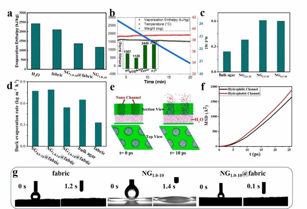 水蒸发作为一种自然现象,是自然界和工业生产中至关重要的过程,在光合作用、海水淡化、脱水技术等多个领域中发挥着重要作用。然而,如何提高蒸发效率一直是科研人员关注的焦点。基于水簇蒸发机理,多孔网络结构能够促进水分子以团簇形式逃逸出蒸发界面,从而降低蒸发界面上的能耗(低焓蒸发);水团簇在空气中,再进一步吸收环境能量破碎成单个气态分子。这种低焓蒸发过程,为提高界面蒸发速率提供了新的途径。近期的研究表面,疏水性孔或者微孔结构能够作为水“活化”的结构单元,促进水簇形成;但这些结构特性对水分子的传输过程会造成较大阻碍,难以适用于快速的界面蒸发过程。如何平衡这种水“活化”和水传输行为成为设计高性能界面蒸发材料的关键难题。